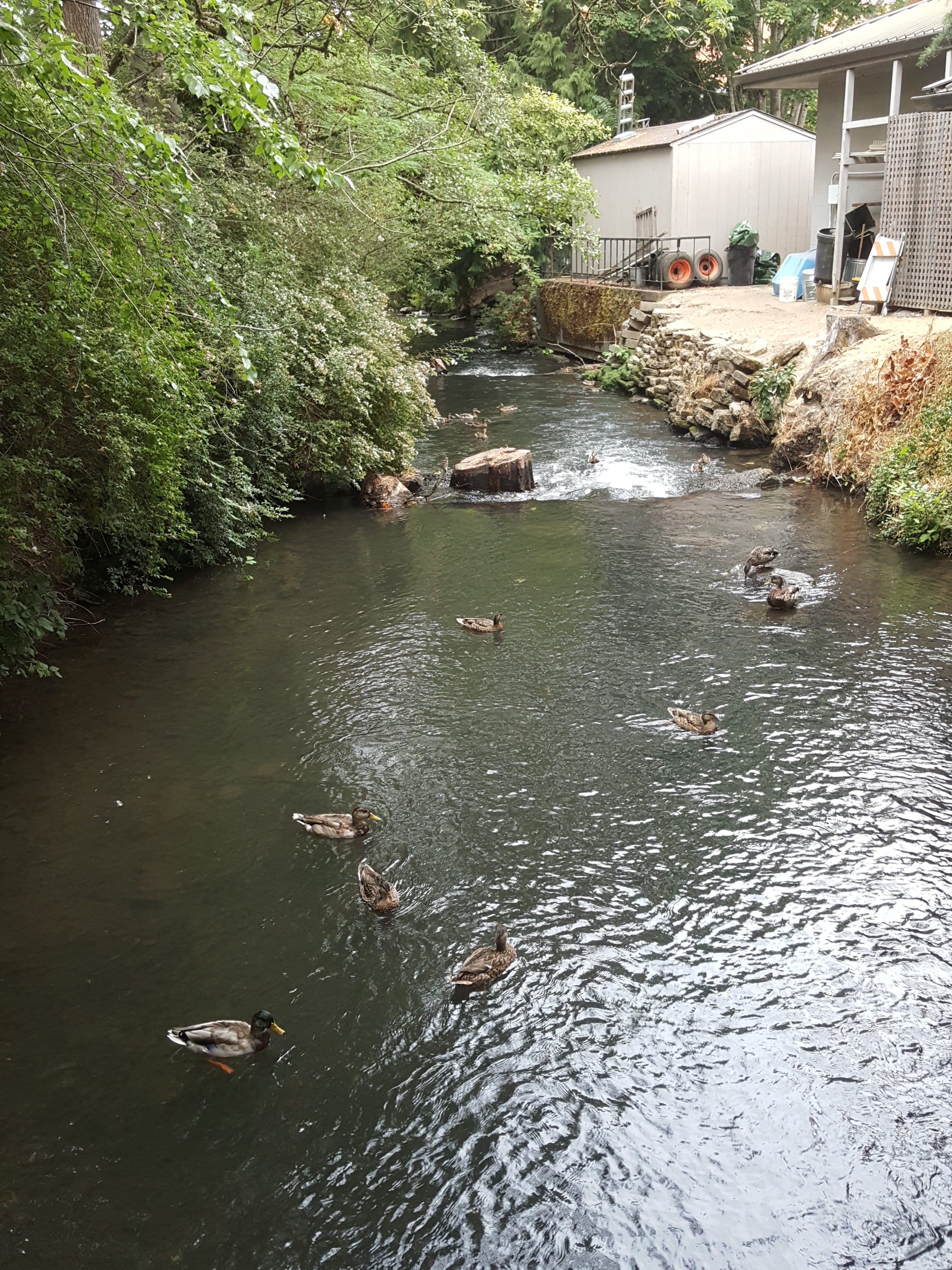 Each morning I am greeted by this paddling of ducks, eager to get close, optimistic for what I imagine is food, willing to swim upstream, navigating the small, but strong waterfall in distinct ways, the A-types flying over it in that aeronautically challenged way ducks fly, all flapping and careening with webbed feet dangling, and the creative types using the eddy of the waterfall to propel them sideways with the proper amount of force, gracefully launching them onto the rock they easily walk across to access the upper pool.  I have nothing for them but do enjoy the show. Among these ducks there are more creatives than A-types, a fact that comforts me as I finish my first week of college.
